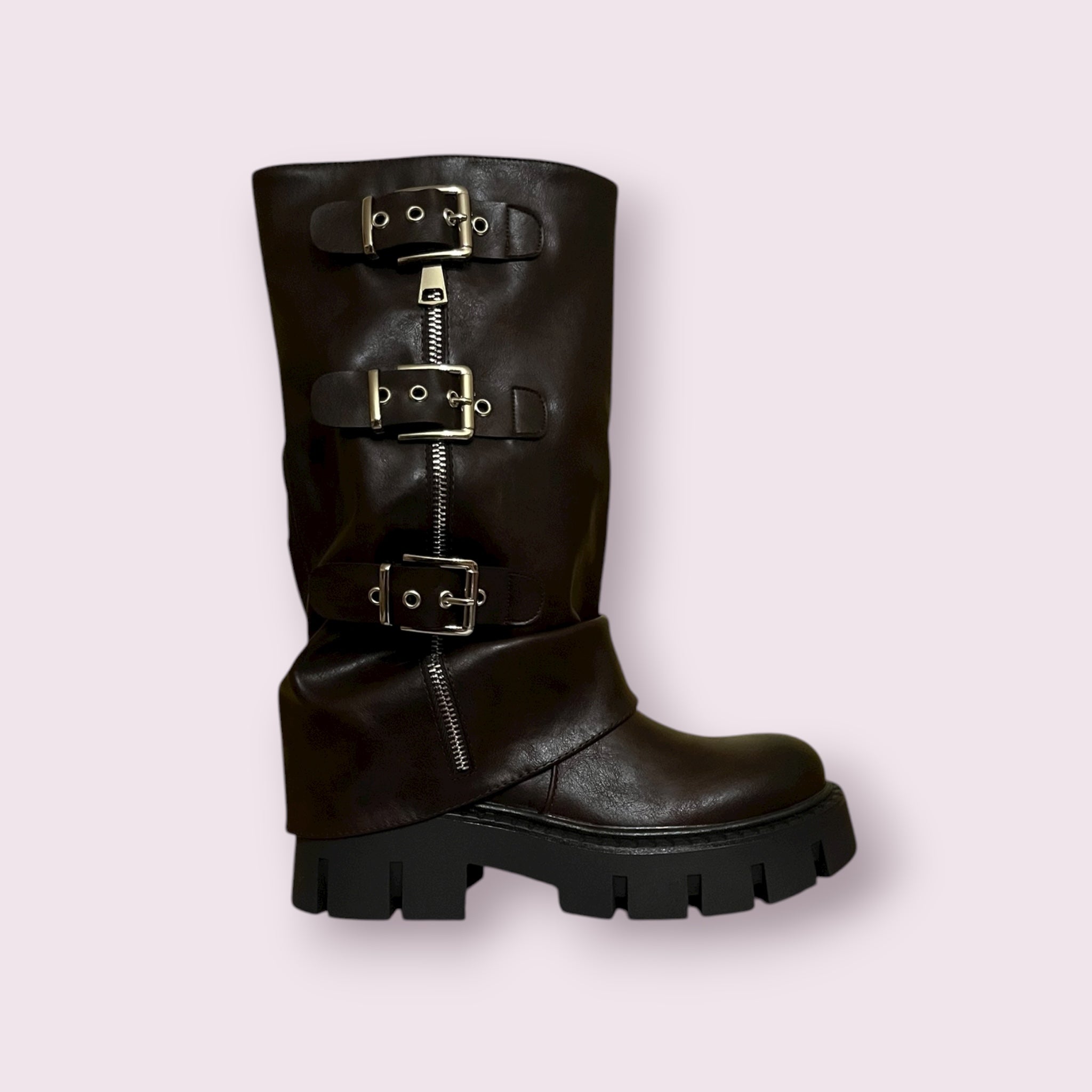 Stivale Alto Anfibio in Ecopelle con Tre Fibbie e chiusura con cerniera.