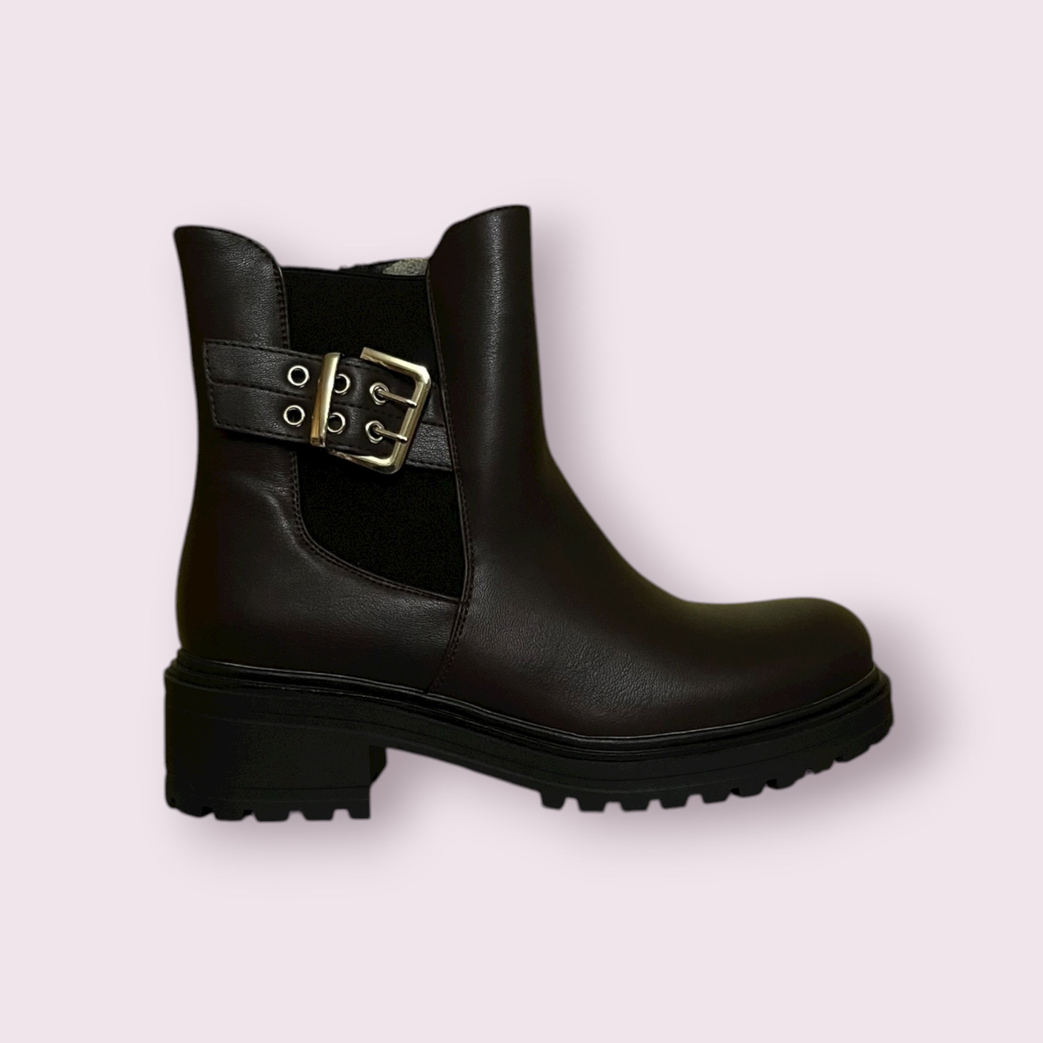 Stivaletto Anfibio in Ecopelle con Fibbia Laterale e chiusura con cerniera.