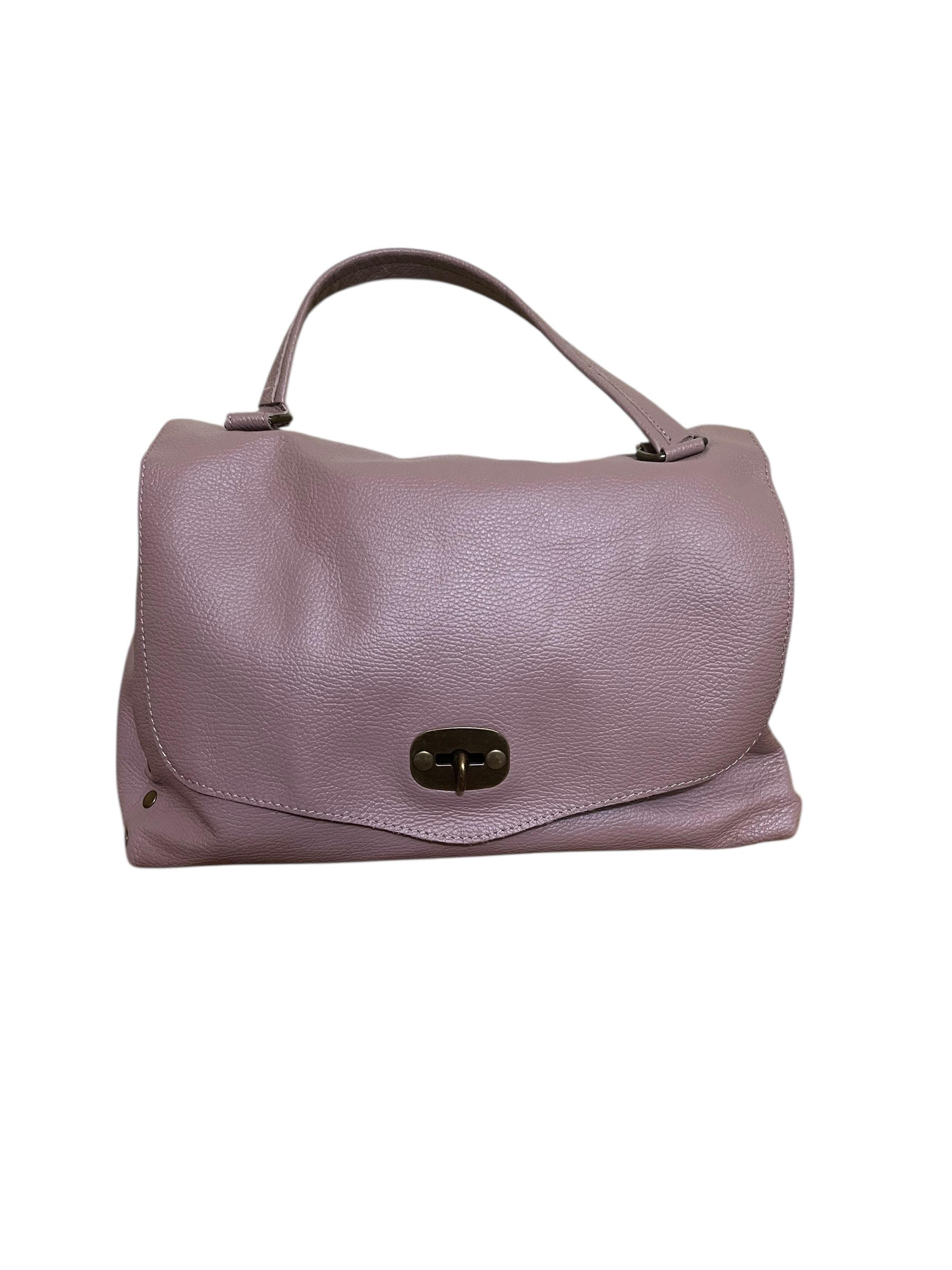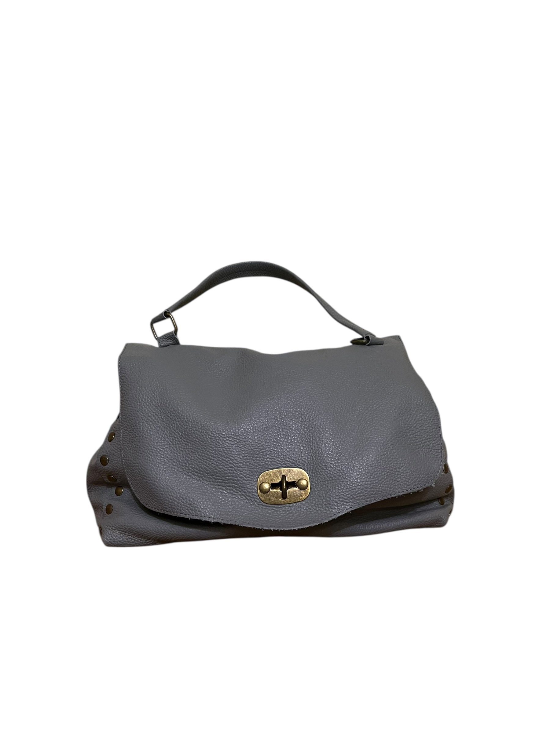 Diana è una borsa fatta a cartella con borchie laterali. È chiusa con patta anteriore ed ha la possibilità di essere utilizzata anche a tracolla. Il materiale da cui è composta è la Vera Pelle Vitello Dollaro, semirigida. L’interno è ben foderato, con cerniera laterale e divisorio centrale, chiuso anch’esso da zip.